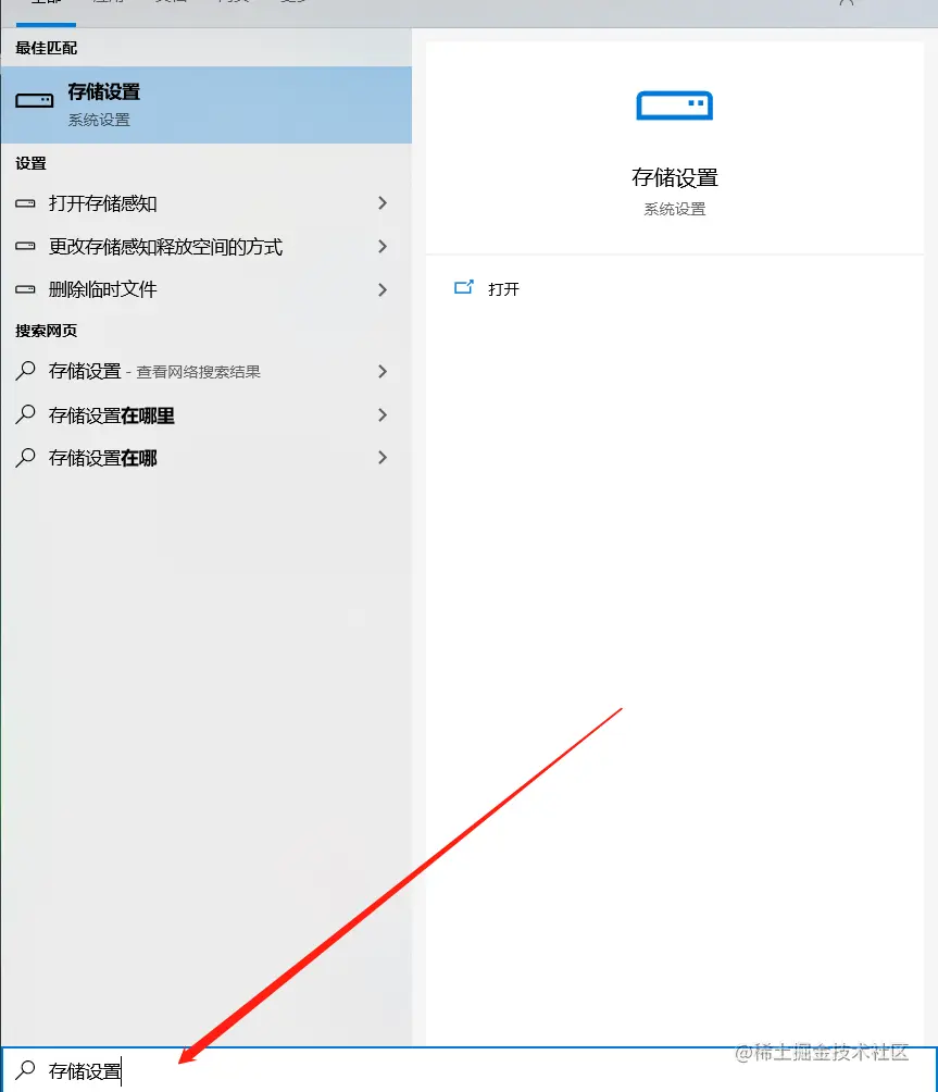 在搜索框中输入:存储设置;此时会自动搜索出:打开存储感知。