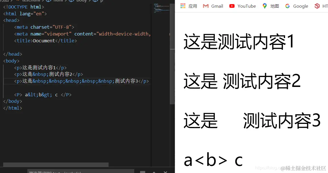 前面测试示例中 空格 的实体表示为  ;大于号>为>;小于号<为 <;