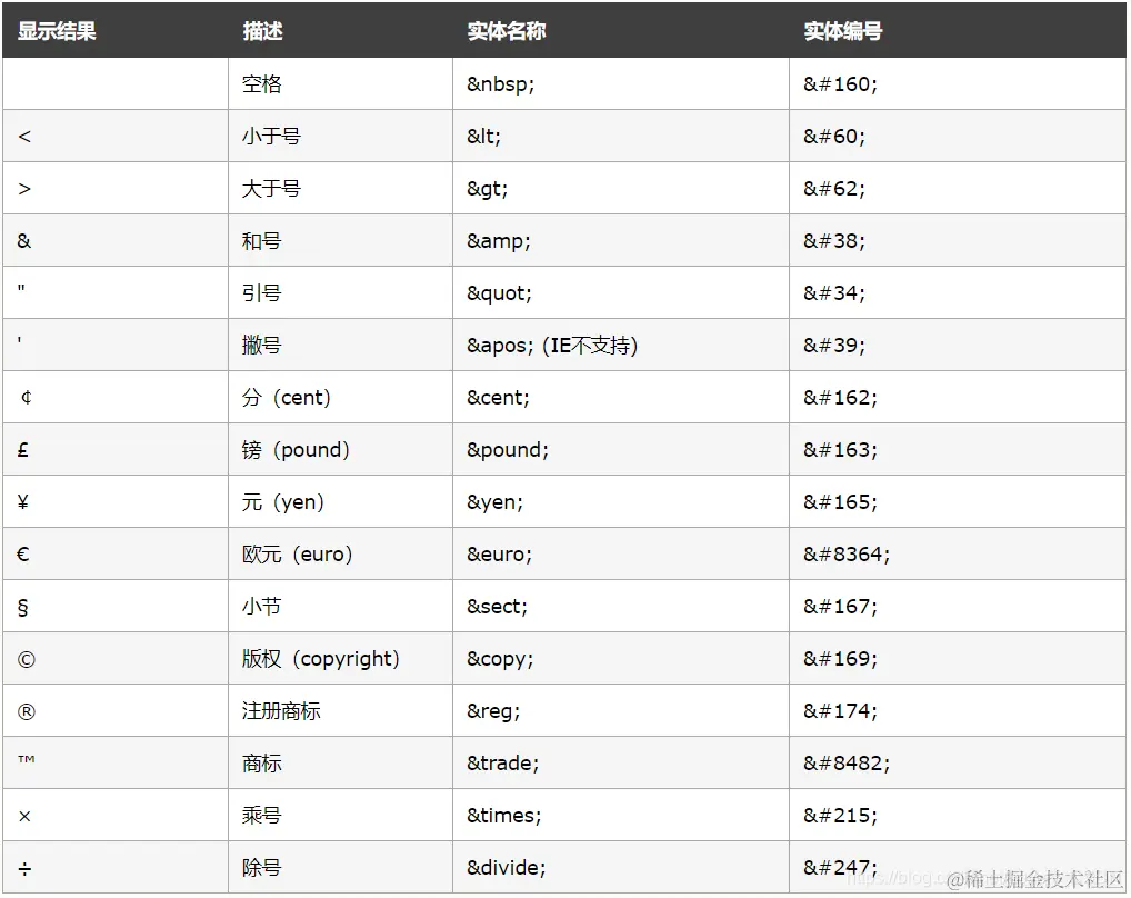 显然,用上实体表达之后,网页如我们预期的一样显示出来了。更多常用的实体表达如下图所示:
