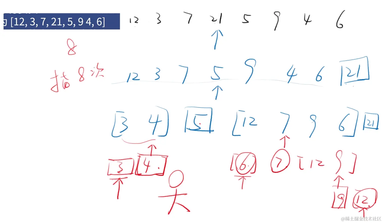 这时数字被分成了2组🤢[3,4] 和 [12,7,9,6],然后体育委员先去[3,4]