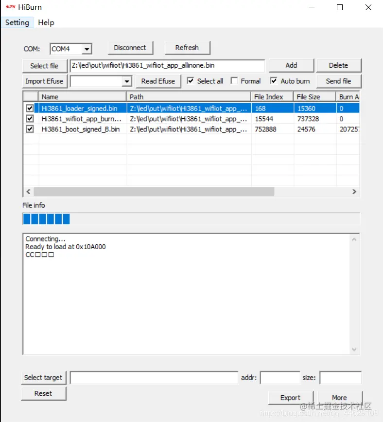 选定文件后,点击connect,按下开发板复位按钮,进行烧录。