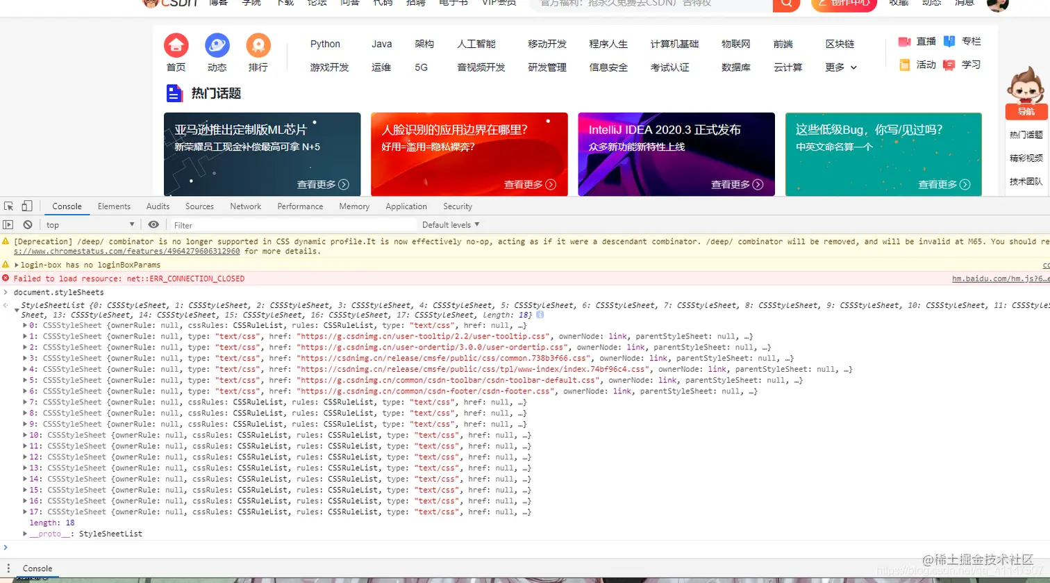 把 CSS 转换为浏览器能够理解的结构--styleSheets。 这里一CSDN为例可以看到它最新的styleSheets,会包含引用的外部 CSS 文件、</style>标记内的 CSS、以及内嵌的 CSS;