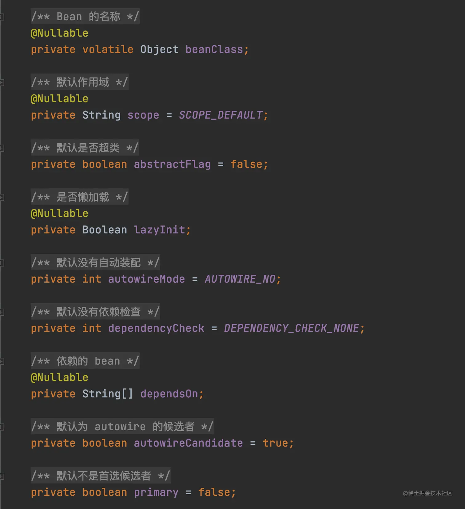 不过还是简要介绍一下方法,大概有 Bean 的名字、作用范围、是否首选、以及 Bean 的初始化销毁方法等等。