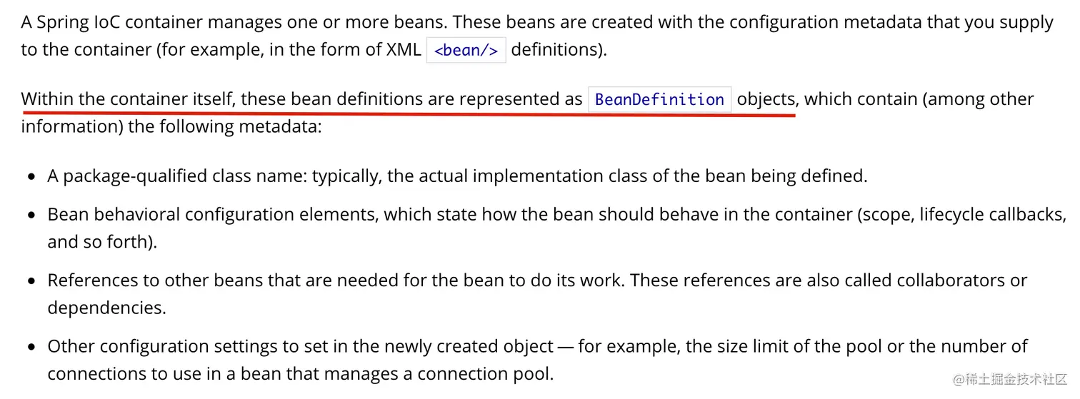 BeanDefinition:顾名思义,就是 Bean 的定义,是用来描述一个 Bean 都有什么信息。前面说在初始化 DefaultListableBeanFactory 时,会初始化一个 Map<String, BeanDefinition>,这个 Map 的功能暂且不说,(PS:查资料说的是存储 bean),所以今天就结合官方文档以及源码,一起了解一下 BeanDefinition!