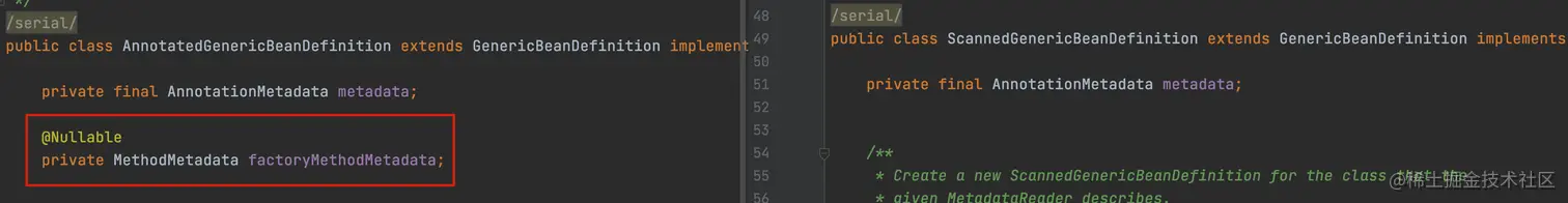二者并无太大区别,只不过 AnnotatedGenericBeanDefinition 比 ScannedGenericBeanDefinition 多了一个 factoryMethodMetadata 的定义。