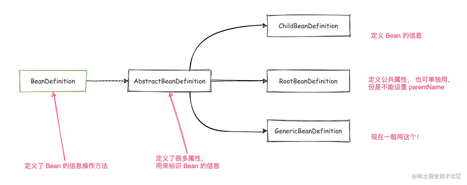 AbstractBeanDefinition 的实现又分为三个:分别是 ChildBeanDefinition、 RootBeanDefinition、 GenericBeanDefinition。