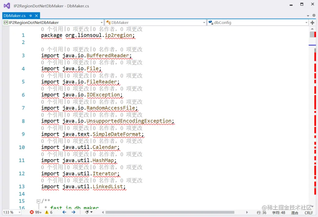 ip2region 的 Java 版数据库生成器 代码并不复杂,源代码文件只有 8 个。以笔者粗浅的 Java 经验来看,因为 C# 与 Java 大体相似,移植过程中无需对程序的结构和命名进行变更,也无需对处理逻辑进行调整。移植需要做的就是让程序可以编译通过,基本上就算成功。