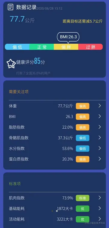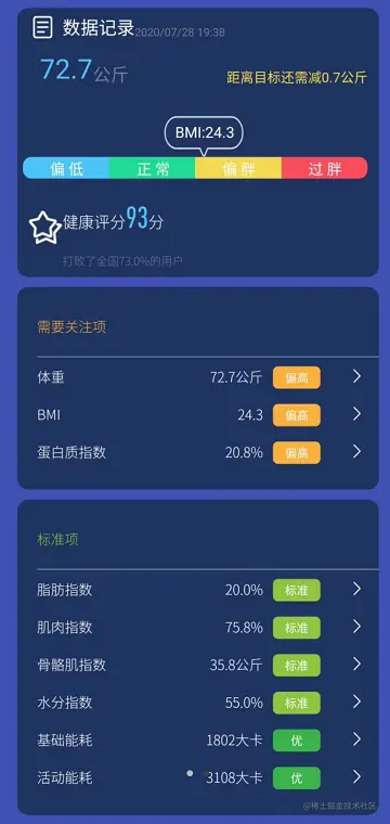 从减肥开始,每天我都会称体重,看各项指标,每天记录比较,经过一个月的减肥计划下来,我也达成了自己的小目标,从将近160减到了140+,作为上班族还是比较欣慰的。