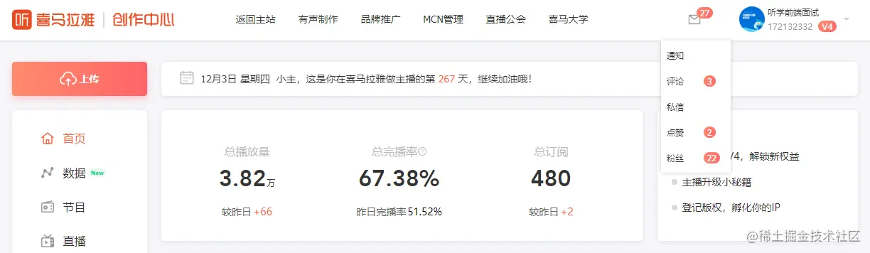做喜马拉雅主播是从今年3月份开始的,分享一些基础的前端面试题讲解思路以及优质的教学视频。关于这件事情的从为什么开始做,到怎么做,再到收获与总结我都在今年的年中征文活动里有些过了。感兴趣的可以移步到这 juejin.cn/post/685003…