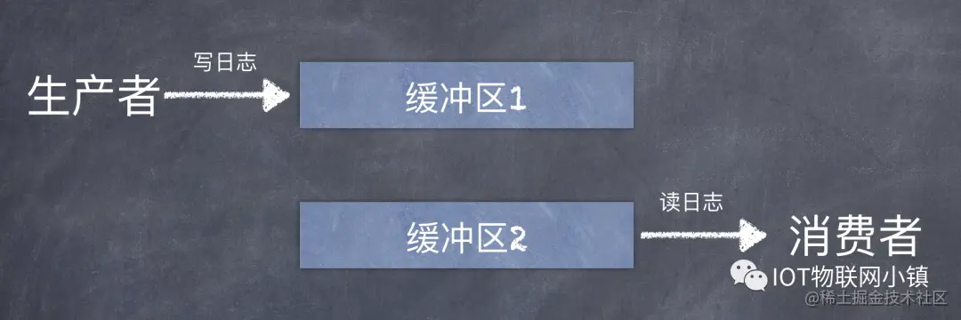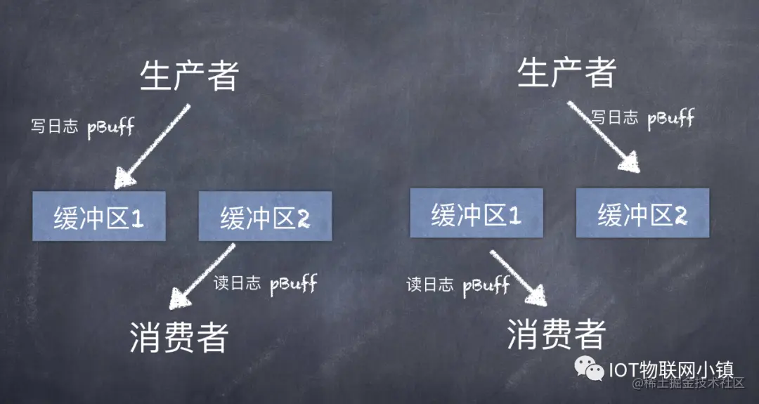 既然消费者的写文件速度比较慢,一定不能影响了生产者的写入效率,所以我们可以用两个消息队列来分别存储:正在写入的日志信息,正在读取的日志信息,也就是所谓的“双缓冲”技术。用图画出来就是这个样子:
