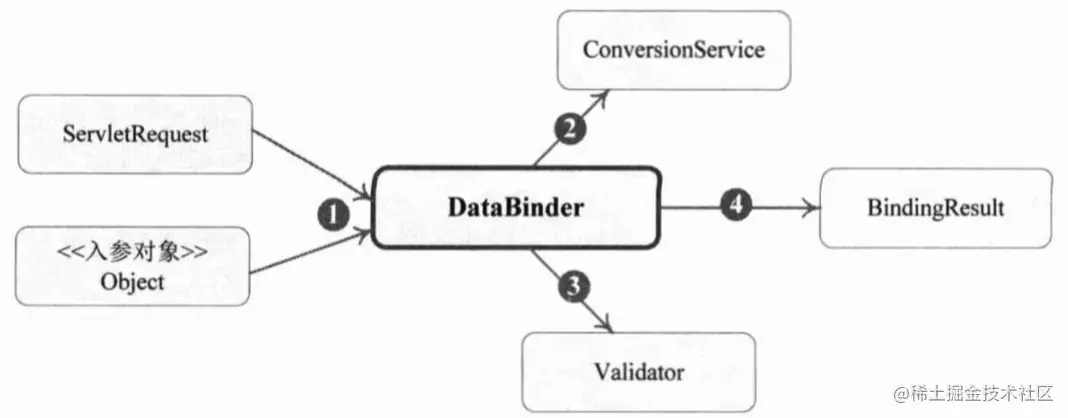 Spring MVC通过反射对目标签名进行分析,将请求消息绑定到处理方法的入参中。数据绑定的核心部件是DataBinder。Spring MVC主框架将ServletRequest对象及处理方法的入参对象实例传递给 DataBinder,DataBinder 首先调用装配在 Spring Web 上下文中的 ConversionService 组件进行数据类型转换、数据格式化等工作,将ServletRequest中的消息填充到入参对象中, 然后调用Validator组件对己经绑定了请求消息数据的入参对象进行数据合法性校验,最 终生成数据绑定结果BindingResult对象。BindingResult包含了已完成数据绑定的入参 对象,还包含相应的校验错误对象。Spring MVC抽取BindingResult中的入参对象及校验错误对象,将它们赋给处理方法的相应入参。