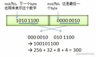 您如何确定这是300?首先取出第一个字节1010 1100最高位为1,表明接下来一个字节是一起的,然后取出紧跟着的一个字节0000 0010发现该字节最高位为0,则表明没有后续。因为varint是最低有效组在前,所以去掉第一个字节的最高位,然后去掉第二个字节的最高位放在第一个字节处理后的数值前面形成100101100 ,如下图所示: