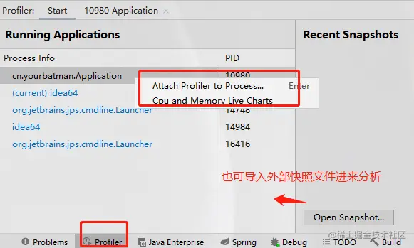 它允许你可以将分析器直接附加到正在运行的应用程序上,进而选择要执行的功能:分析快照、监控CPU内存等等。