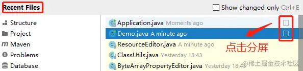 如果想分屏的文件不在顶部选项卡里,IDEA也为你考虑到了,最近文件里也给你提供了入口: