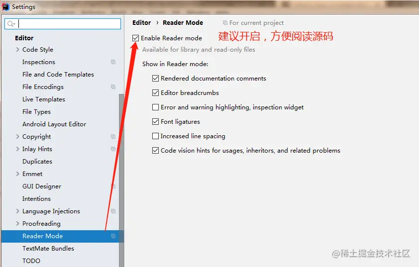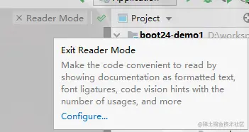 默认情况在Reader模式下打开只读文件(也可以是本项目的只读文件)和来自外部库(Jar内)的文件,注释就像被格式化过一样,方便阅读。如下图表示你当前正在以阅读模式看此文件: