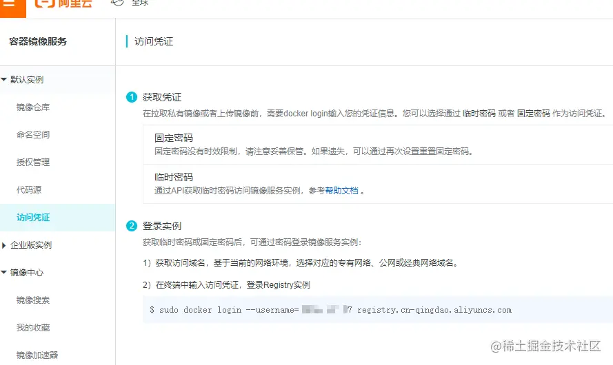 Error response from daemon: pull access denied for tomacat, repository does not exist or may require 'docker login': denied: requested access to the resource is denied 说明没有配置访问凭证,然后同样是在'容器镜像服务'菜单下点击'访问凭证'进入到如下界面: