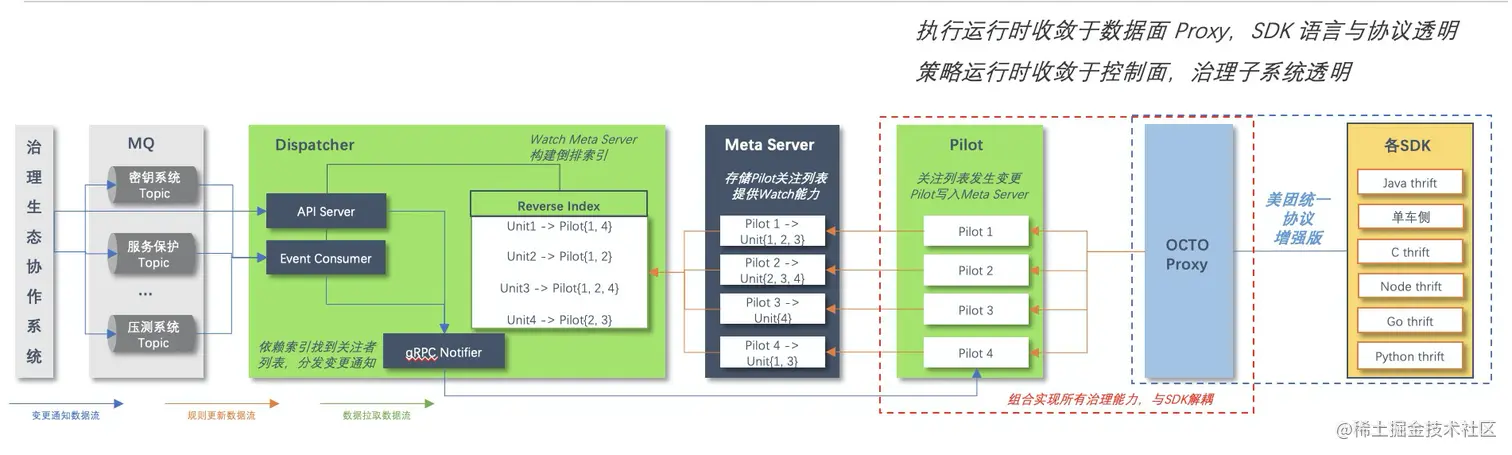 - 架构层面由控制面统一对接各个治理子系统,屏蔽注册中心、鉴权、限流等系统具体实现机制的异构性。