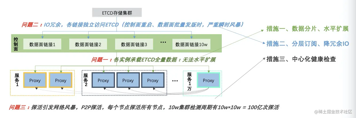 - 每个 Proxy 链接相当于独立与 ETCD 交互,而同一个服务的 Proxy 请求内容都相同,独立交互有大量的 I/O 冗余。当 Proxy 批量发版或网络抖动时,瞬时风暴很容易压垮控制面及 ETCD。