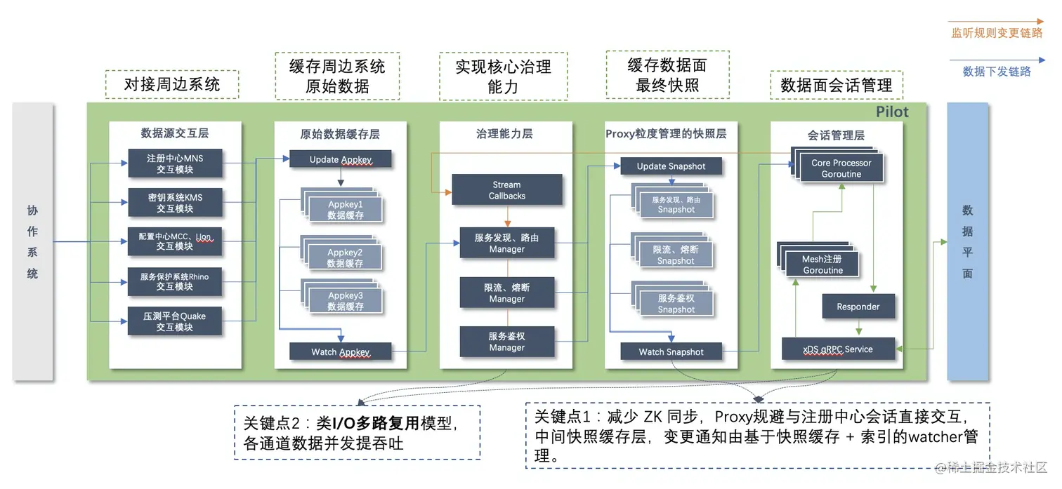 - 关键点 1:基于快照缓存 + 索引的机制来减少 ZK watcher 同步。以注册中心为例,常规实现方式下,如果每个 Proxy 关注 100 个节点,1 万个节点就会注册 100 万个 watcher,相同服务的 Proxy 所关注内容是相同的,另外不同服务 Proxy 所关注的也有很多交集,其中包含大量的冗余。分层订阅模式下,Proxy 不与注册中心直接交互,通过中间的快照缓存与分层,确保每个 Pilot 实例中 ZK 相同路径的监听最多只用1个 watcher,获取到 watcher 通知后,Pilot 根据内部的快照缓存 + 索引向所有关注者分发,大大降低了冗余。