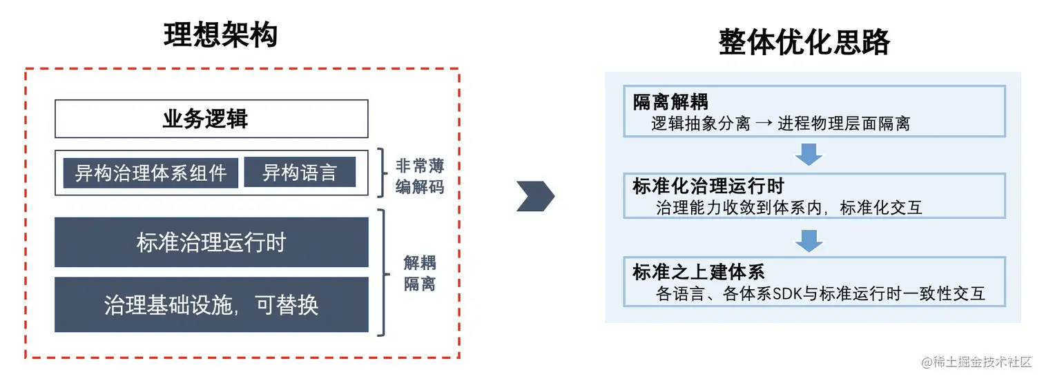 所以,我们整体的优化思路分为三步:隔离解耦,在隔离出的基础设施层建设标准化治理运行时,标准之上建体系。