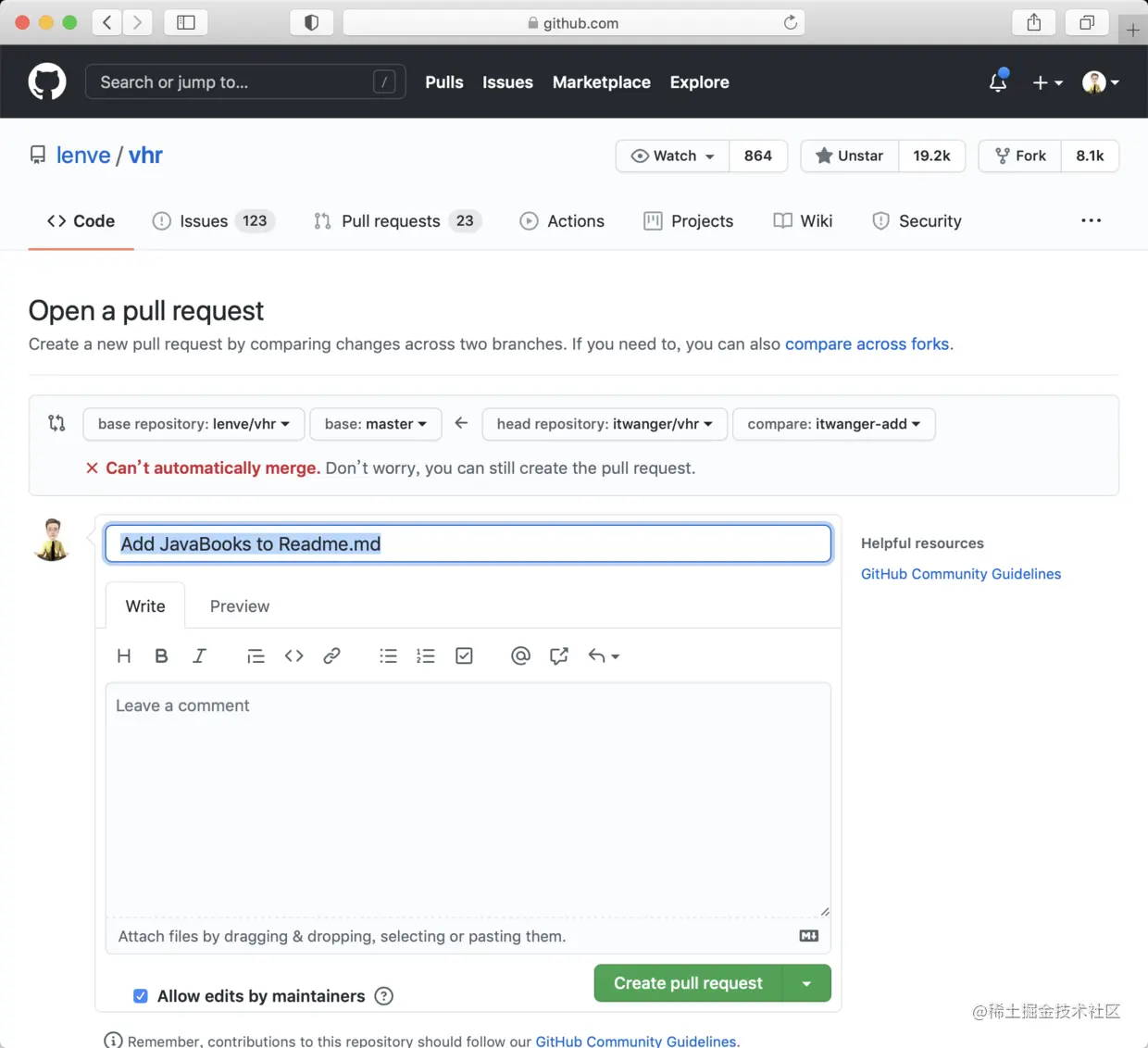 到了这一步,还等什么,抓紧时间提交吧,点击「Create Pull Request」按钮,会跳转到下一个页面。