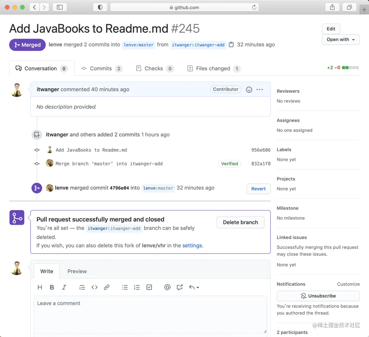 刷新一下当前的 PR,就可以看到 PR 已经成功 merge 了。