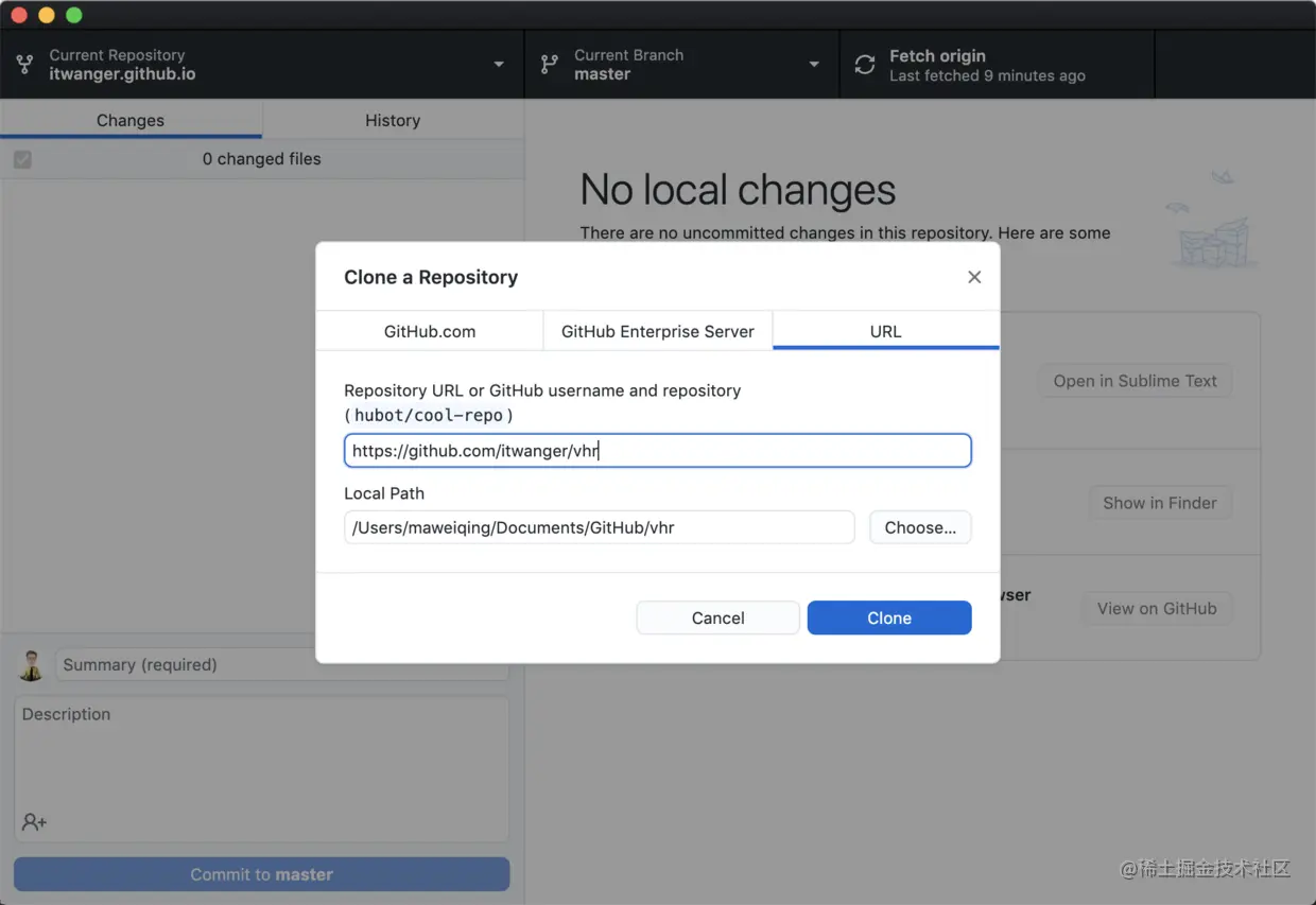 然后就会跳转到 GitHub 桌面版,点击「Clone」。