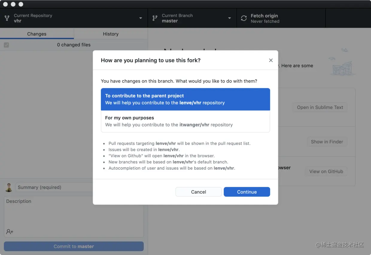 等待片刻,可能会比较慢,稍安勿躁,毕竟你懂。当出现下面这个提示(问你用这个项目干嘛,当然是成为项目的贡献者了,嘿嘿)的时候,点击「Continue」