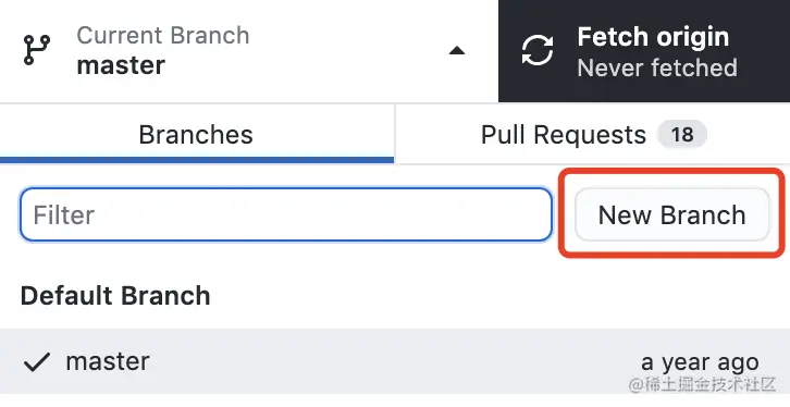 现在,来创建一个分支,点击「Current Branch」,然后在弹出式菜单上点击「New Branch」。