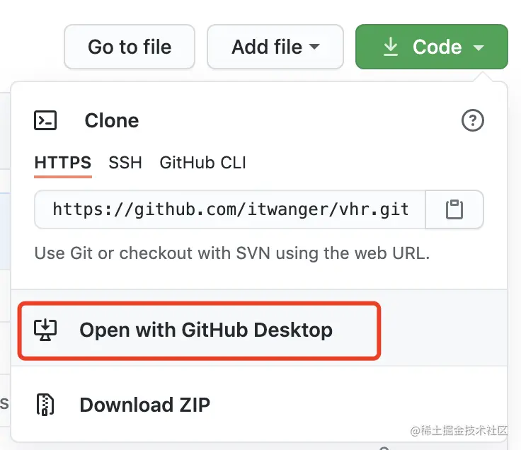 点击绿色的「Code」按钮,然后选择「Open with GitHub Desktop」。