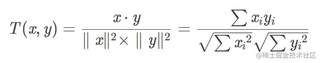 我们都知道,对于坐标中的两个点,如果它们之间的夹角越小,这两个点越相似,这就是初中学过的余弦距离,它的计算公式如下: