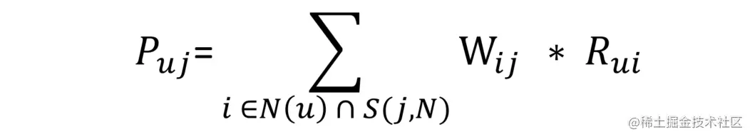 其中,Puj 表示用户 u 对物品 j 的感兴趣程度,值越大,越值得被推荐。N(u) 表示用户 u 感兴趣的物品集合,S(j,N) 表示和物品 j 最相似的前 N 个物品,Wij 表示物品 i 和物品 j 的相似度,Rui 表示用户 u 对物品 i 的兴趣度。