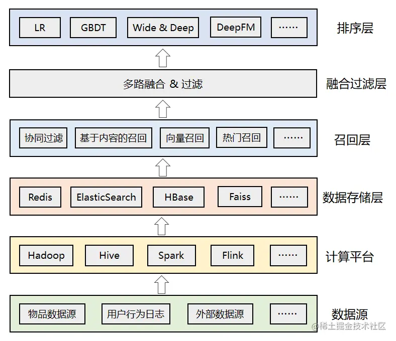 上面是推荐系统的整体架构图,自下而上分成了多层,各层的主要作用如下: