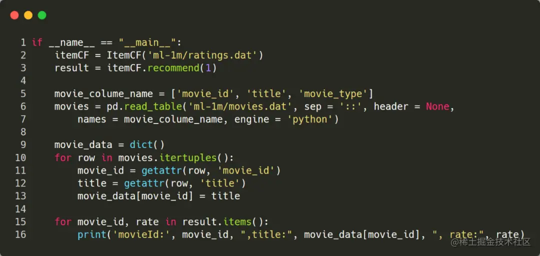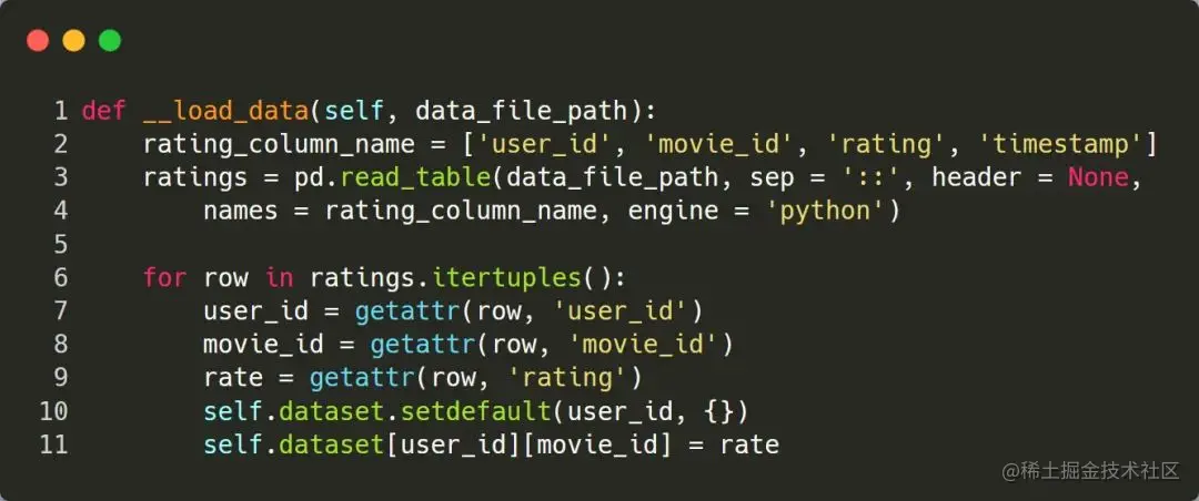程序主要使用数据集中的 ratings.dat 这个文件,通过解析该文件,抽取出 user_id、movie_id、rating 3个字段,最终构造出算法依赖的数据,并保存在变量 dataset 中,它的格式为:dict[user_id][movie_id] = rate