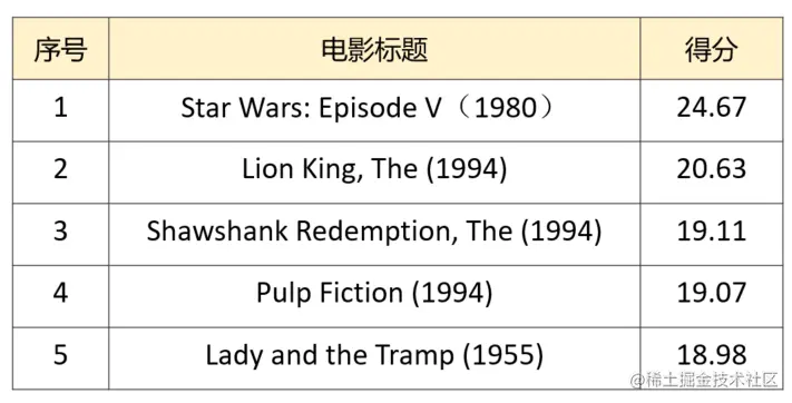 最后,可以基于相似度矩阵进行推荐了,输入一个用户id,先针对该用户评分过的电影,依次选出 top 10 最相似的电影,然后加权求和后计算出每个候选电影的最终评分,最后再选择得分前 5 的电影进行推荐。