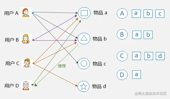 - **基于用户的协同过滤:**User-CF,核心是找相似的人。比如下图中,用户 A 和用户 C 都购买过物品 a 和物品 b,那么可以认为 A 和 C 是相似的,因为他们共同喜欢的物品多。这样,就可以将用户 A 购买过的物品 d 推荐给用户 C。