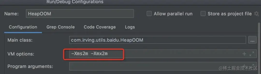 再次修改配置,去除元空间限制,修改堆内存大小-Xms20m -Xmx20m,可以看见堆内存报错。