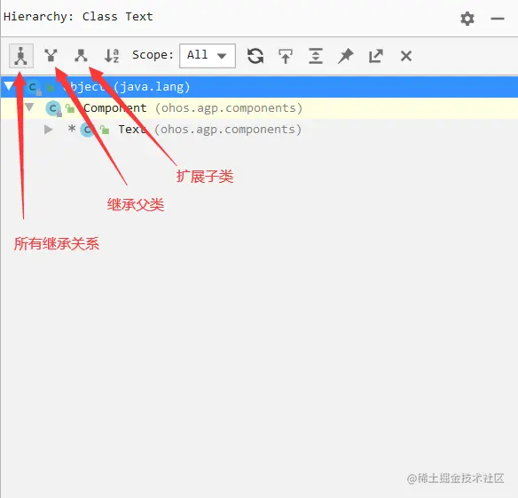 这里我们说一下如何查看类的继承关系,由于DevEco是基于开源的社区版,它是没有Diagrams功能的,我们可以使用第二种方法Navigate --> Type Hierarchy(或者F4)来查看关系图。
