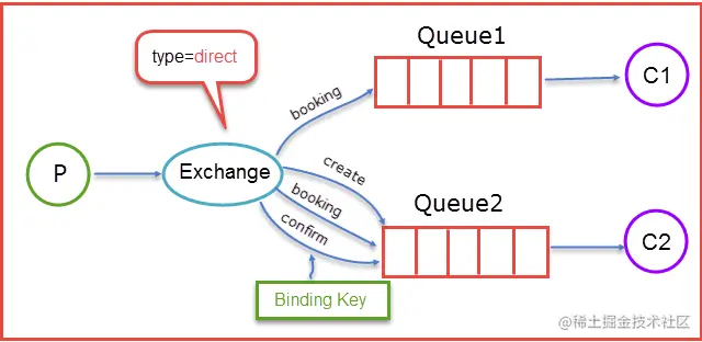 当生产者(P)发送消息时Rotuing key=booking时,这时候将消息传送给Exchange,Exchange获取到生产者发送过来消息后,会根据自身的规则进行与匹配相应的Queue,这时发现Queue1和Queue2都符合,就会将消息传送给这两个队列,如果我们以Rotuing key=create和Rotuing key=confirm发送消息时,这时消息只会被推送到Queue2队列中,其他Routing Key的消息将会被丢弃。