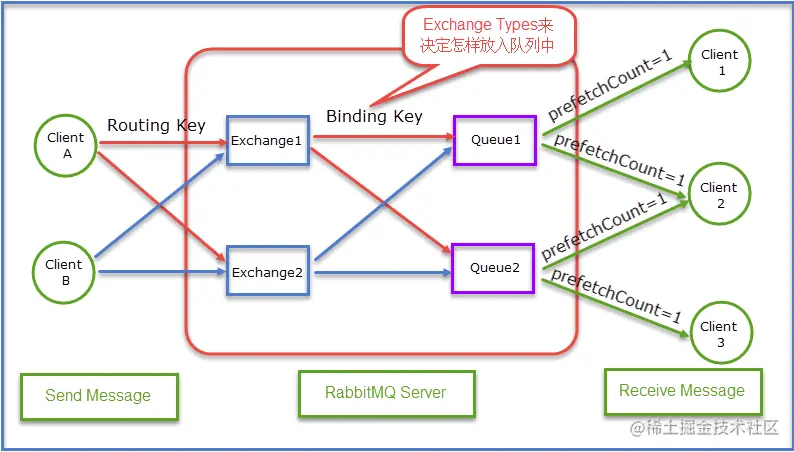 - Client 1,2,3:也叫Consumer,数据的接收方。Consumersattach to a broker server (RabbitMQ) and subscribe to a queue。把queue比作是一个有名字的邮箱。当有Message到达某个邮箱后,RabbitMQ把它发送给它的某个订阅者即Consumer。当然可能会把同一个Message发送给很多的Consumer。在这个Message中,只有payload,label已经被删掉了。对于Consumer来说,它是不知道谁发送的这个信息的。就是协议本身不支持。但是当然了如果Producer发送的payload包含了Producer的信息就另当别论了。