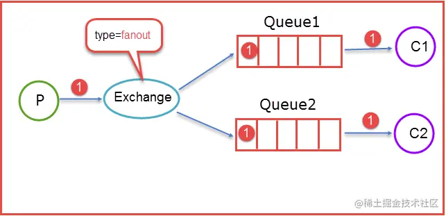 生产者(P)生产消息1将消息1推送到Exchange,由于Exchange Type=fanout这时候会遵循fanout的规则将消息推送到所有与它绑定Queue,也就是图上的两个Queue最后两个消费者消费。