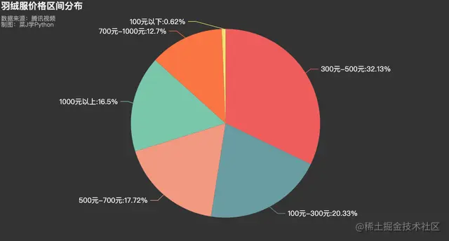 .set_global_opts(legend_opts = opts.LegendOpts(is_show = False),title_opts=opts.TitleOpts(title="羽绒服价格区间分布",subtitle="数据来源:腾讯视频\n制图:菜J学Python",pos_top="0.5%",pos_left = 'left'))