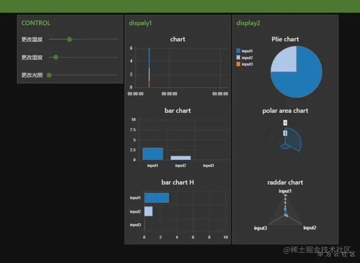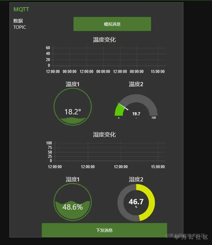 在下面这个界面中,我进行了两个温度、两个湿度数据的展示;当订阅的主题接受到消息后,解析json数据格式,得到温湿度数据并展示在前端