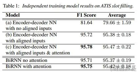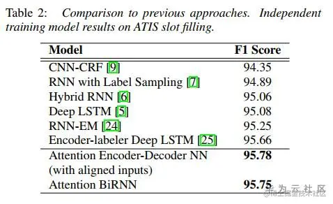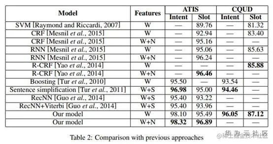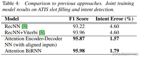 表4显示了与先前报告的结果相比,在意图检测和槽填充方面的联合训练模型性能。