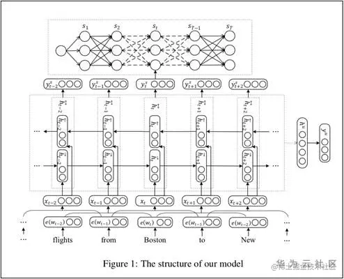 联合意图识别和槽位填充的基于注意力的RNN模型如下图所示: