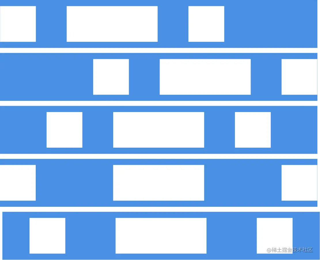 - space-around:每根轴线两侧的间隔都相等。所以,轴线之间的间隔比轴线与边框的间隔大一倍。