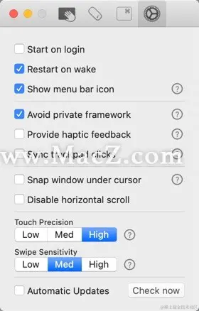 Multitouch可以让您将自定义动作绑定到特定的魔术触控板或魔术鼠标手势。例如,三指点击可以执行粘贴。通过执行键盘快捷键,控制浏览器的选项卡,执行鼠标中键单击等等来改进您的工作流程。