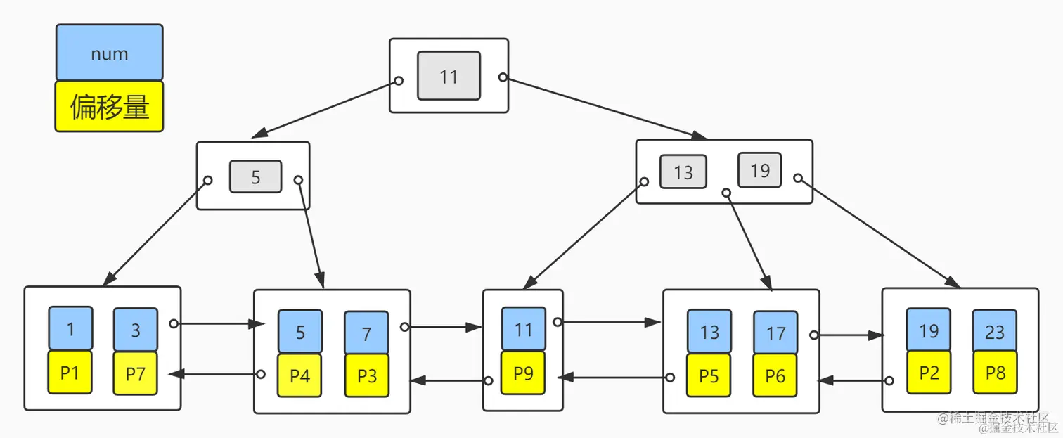 二级索引子节点也只存储了索引列(num)和文件的偏移量(P),但可以看出num是有序的,这在范围查找(比如:where num > 3)是非常有利的,但文件的偏移量并没有规律,当需要回表查询其他字段,可能会导致多次随机I/O。