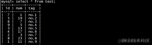 然后插入下面的数据,id从1-9,故意把插入顺序打乱,tag代表插入顺序