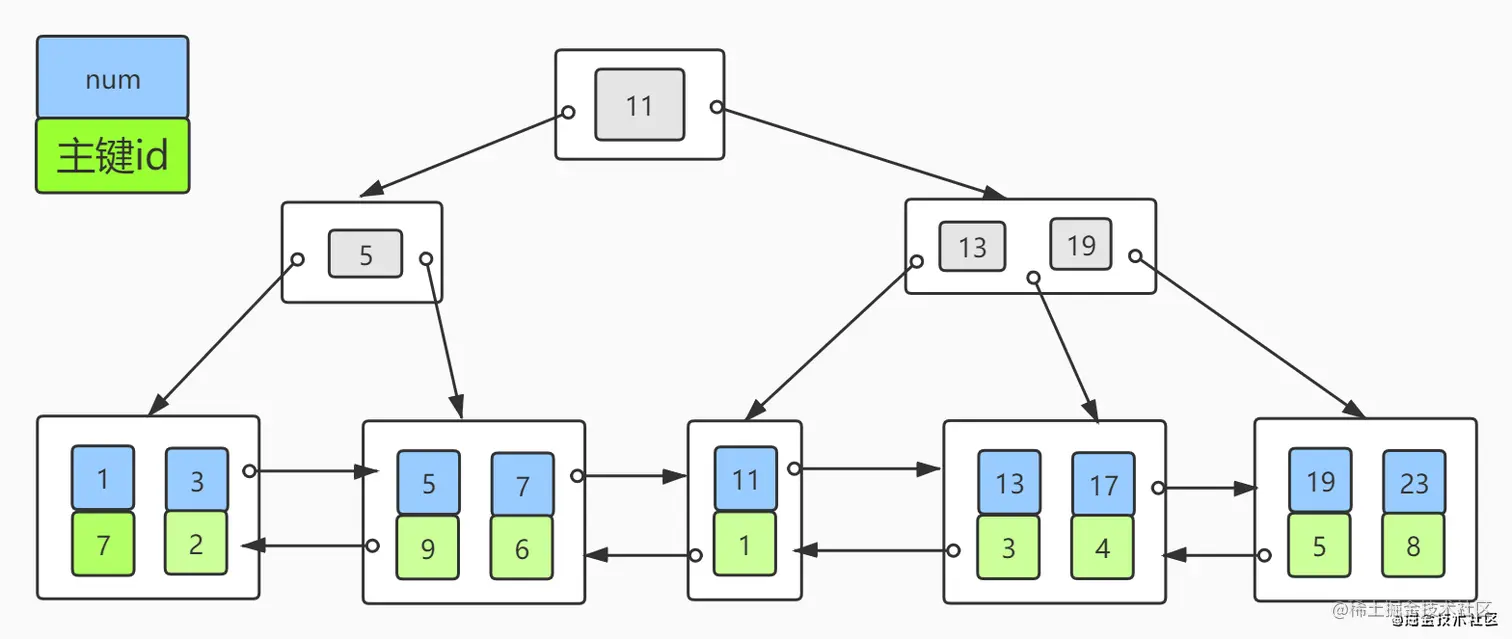 其实MyISAM的二级索引和主键索引并无区别,只是名称不同罢了,二级索引key(num)分布如下图: